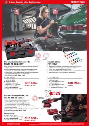 30 Die Ausstattung der Maschinen entspricht der %u00fcblichen Grundausstattung. Technische %u00c4nderungen, Preis%u00e4nderungen und Irrtum vorbehalten. Alle Preise verstehen sich als unverbindliche Preisempfehlung exkl. MwSt. + vRB.Aktion g%u00fcltig bis 31.03.2026Nur solange der Vorrat reicht3 Jahre Garantie ohne RegistrierungDer smarte Akku-Polierer 12VPXE 80 12-EC/2.5 SET%u0083 F%u00fcr rotative und exzentrisch freilaufende Arbeiten mit 3 und 12 mm Hub%u0083 Innovatives, werkzeugloses Schnellwechselsystem f%u00fcr den Austausch der Antriebsarten rotativ und exzentrisch%u0083 Flexibel und einfach wie nie zuvor, vom Bl%u00fctenschliff bis zum hologrammfreien Finishing mit einem Ger%u00e4t%u0083 Leerlaufdrehzahl 400 - 5800 1/minBestell-Nr. 532.268%u0083 1x PXE 80 12-EC%u0083 1x Adapter rotativ%u0083 1x Adapter exzentrischfreilaufend 3 + 12 mm Hub%u0083 3x Spezial Klebe-Teller%u0083 2x Akku AP 12/2.5 Ah%u0083 1x Schnellladeger%u00e4t CA 12/18Exzenter, freilaufendRotativFlexible WelleFS 140 SetBestell-Nr. 516.112%u0083 12x Polier-Kegel(je 4 soft, medium und hart)%u0083 12x Polier-Zylinder(je 4 soft, medium und hart)%u0083 1x Tiefzieheinlage%u0083 1x Transportkoffer L-BOXX%u00ae 102%u0083 Mit der flexiblen Welle zu der Poliermaschine PXE 80 12-EC entsteht ein innovatives System im Spotrepair-Bereich. %u0083 L%u00e4nge 1400 mm f%u00fcr maximal 6000 /min. %u0083 Hochwertigste Materialen garantieren eine maximale Lebensdauer. %u0083 Ergonomie durch extrem schlanken Griffbereich.CHF 535.%u2013exkl. MwSt. + vRB. (2.16)CHF 255.%u2013exkl. MwSt.Akku-Exzenterpolierer 18V XFE 15 150 18-EC SET%u0083 Neue Generation b%u00fcrstenloser Motoren mit hohem Wirkungs- und Leistungsgrad%u0083 Neu entwickeltes Hochleistungsgetriebe f%u00fcr maximale Ger%u00e4usch- und Vibrationsreduktion%u0083 Idealer Drehzahlbereich f%u00fcr die Bereiche Automotive, Maritim und Aviation%u0083 Leistungsstark wie ein Kabel-Polierer %u00fcber die gesamte Akku-Laufzeit%u0083 Leerlaufdrehzahl 1350 %u2013 4350 1/minBestell-Nr. 533.021%u0083 1x XFE 15 150 18-EC%u0083 1x Spezial Klett-Teller ged%u00e4mpft%u0083 2x Akku AP 18/5.0 Ah%u0083 1x Schnellladeger%u00e4t CA 12/18CHF 800.%u2013exkl. MwSt. + vRB. (2.16)Exzenter, freilaufend