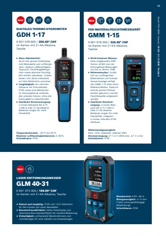 DIGITALES THERMO-HYGROMETERGDH 1-170 601 078 400 / 250.00* CHFim Karton mit 2%u2009%u00d7%u2009AA-Alkaline, Tasche %u25fe Klare Ablesbarkeit: durch das grosse Farbdisplay sind Messwerte wie Lufttemperatur, relative Luftfeuchtigkeit, Taupunkt, Feuchtkugeltemperatur sowie absolute Feuchtigkeit einfach abzulesen. Zudem lassen sich diese individuell auf dem Bildschirm anordnen%u25fe Langlebigkeit: ein robustes Geh%u00e4use mit Schutzklasse IP%u200665 sowie eine Membrane im Sensorgeh%u00e4use sch%u00fctzen den pr%u00e4zisen Sensor, ohne die Genauigkeit zu beeinflussen%u25fe Zweifache Stromversorgung: Li-Ionen Akkupack BA 3.7V 1.0Ah A oder 2%u2009%u00d7%u2009AA-Alkaline Batterien sorgen f%u00fcr mehr Flexibilit%u00e4tTemperaturbereich: %u201320%u2009%u00b0C bis 50%u2009%u00b0CRelativer Luftfeuchtigkeitsbereich: 5%u201395%u2009%Schutzklasse: IP%u200665PAD-MATERIALFEUCHTEMESSGER%u00c4TGMM 1-150 601 078 200 / 326.00* CHF im Karton mit 2%u2009%u00d7%u2009AA-Alkaline, Tasche %u25fe Nicht-Invasives Messen:dank eingebautem EMFSensor erh%u00e4lt man zerst%u00f6rungsfreie Messungen von bis zu 30%u2009mm Tiefe%u25fe Referenzmodus: Zus%u00e4tzlich zur umf%u00e4nglichen Materialliste und Schwellenwertanzeige verf%u00fcgt das GMM 1-15 %u00fcber einen Referenz-Modus. Dadurch k%u00f6nnen grosse Fl%u00e4chen einfach gescannt und die Feuchtequelle aufgesp%u00fcrt werden%u25fe Zweifache Stromversorgung: Li-Ionen Akkupack BA 3.7V 1.0Ah%u00a0A oder 2%u2009%u00d7%u2009AA-Alkaline Batterien sorgen f%u00fcr mehr Flexibilit%u00e4t, integriert in einem robusten IP%u200665 Geh%u00e4useWiderstandsgenauigkeit: Holz: %u00b1%u20094%u2009%, Geb%u00e4ude: relativer WertStromversorgung: 2%u2009%u00d7%u20091,5 V LR06 (AA), 3,7 V Li-IonSchutzklasse: IP%u200665NEU! NEU!LASER-ENTFERNUNGSMESSERGLM 40-310 601 075 000 / 109.00* CHF im Karton mit 2%u2009%u00d7%u2009AA-Alkaline, Tasche %u25fe Robust und langlebig: IP%u200665 und 1,5%u2009m Fallschutz f%u00fcr den Einsatz auf rauen Baustellen%u25fe Benutzerfreundlichkeit: helles Farbdisplay und optimierte Benutzeroberfl%u00e4che f%u00fcr intuitive Bedienung%u25fe Vielseitigkeit: umfassende Messfunktionen und -einstellungen f%u00fcr eine Vielzahl von AnwendungenNEU!Messbereich: 0.05%u2009%u2013%u200940 mMessgenauigkeit: %u00b1%u20091.5 mm1 (%u00b9plus nutzungsabh%u00e4ngige Abweichung)Schutzklasse: IP%u20066511Bosch PRO NEWS Schweiz | 01.09.%u2009%u2013%u200931.12.2025 | Tertial 3