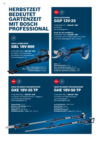 AKKU-TELESKOP-HOCHENTASTERGKE 18V-25 TPSchwertl%u00e4nge: 25 cmEffektive Arbeitsl%u00e4nge: 23 cm%u00d6ltank Inhalt: 100 mlS%u00e4gekette: Oregon 80 BXVerl%u00e4ngerung (min %u2013 max): 240 %u2013 290 cmAKKU-TELESKOP-HECKENSCHEREGHE 18V-50 TPLeerlaufhubzahl: 3.400 U/minMesserl%u00e4nge: 50 cmZahn%u00f6ffnung: 23,5 mmAnti-Blockier-SystemVerl%u00e4ngerung (min %u2013 max): 200 %u2013 250 cm0%u2005600%u20058D5%u2005000 / 349.00* CHFim Karton mit Messerschutz und SchultergurtServicekategorie: B0%u2005600%u20058D6%u2005000 / 429.00* CHFim Karton mit Messerschutz, Tragegurt und Schraubenschl%u00fcsselServicekategorie: CHERBSTZEIT BEDEUTET GARTENZEIT MIT BOSCH PROFESSIONALAKKU-ASTSCHEREGGP 12V-25Volt: 12 VBatteriekapazit%u00e4t: 3,0 AhMax. Schnittdurchmesser: 25 mmGewicht mit 12V 3.0Ah Batterie: 1,0%u2009kgAnzahl der Schnitte pro Ladung: 4.5000%u2005600%u20058D8%u2005101 / 200.00* CHFim KartonServicekategorie: %u2013Auch als Set erh%u00e4ltlich:0%u2005600%u20058D8%u2005100 / 310.00* CHFim Karton mit 2%u00d7%u2006Akkus GBA%u200512V%u20053.0AH und Schnellladeger%u00e4t GAL%u200512V-20AKKU-LAUBBL%u00c4SERGBL 18V-800Max. Luftdurchsatz: 800%u2006m%u00b3/hMax. Luftgeschwindigkeit: 200%u2006km/hSchalldruckpegel: 82 dB(A)0%u2005600%u20058D2%u2005200 / 257.00* CHFim Karton mit Flachd%u00fcse, Rundd%u00fcse und Verl%u00e4ngerungServicekategorie: CNEU!NEU! NEU!12