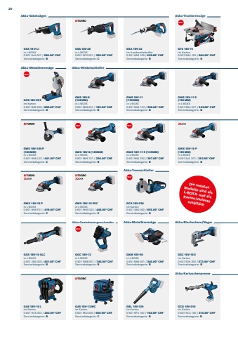 GWS 18V-180 P(180%u2009MM)in L-BOXX0%u2005601%u20059H6%u2005L02 / 441.00* CHFServicekategorie: CGWX 18V-15 Pin L-BOXX0%u2005601%u20059H6%u2005F01 / 419.00* CHFServicekategorie: CGGC 18V-12in L-BOXX0%u2005601%u20059M8%u2005001 / 740.00* CHFServicekategorie: BGAS 18V-12 MCim Karton 0%u2005601%u20059K2%u2005000 / 600.00* CHF Servicekategorie: CGKM 18V-50in L-BOXX0%u2005601%u20056B8%u2005001 / 346.00* CHFServicekategorie: BGSA 18 V-LIin L-BOXX0%u2005601%u200564J%u2005007 / 280.00* CHFServicekategorie: BGBL 18V-120im Karton0%u2005601%u20059F5%u2005100 / 104.00* CHF Servicekategorie: BGSC 18V-16 Eim Karton 0%u2005601%u2005926%u2005300 / 573.00* CHF Servicekategorie: BGCG 18V-310im Karton 0%u2005601%u20059C4%u2005100 / 374.00* CHF Servicekategorie: BGAS 18V-10 L im Karton 0%u2005601%u20059C6%u2005302 / 203.00* CHF Servicekategorie: BGWX 18V-8 (125MM)in L-BOXX0%u2005601%u20059N9%u2005101 / 226.00* CHFServicekategorie: BGWX 18V-15 PSCin L-BOXX0%u2005601%u20059H6%u2005G02 / 446.00* CHFServicekategorie: CGCS 18V-230im Karton 0%u2005601%u20053B0%u2005000 / 655.00* CHF Servicekategorie: DGWX 18V-11 S (125MM)in L-BOXX0%u2005601%u20059N4%u2005200 / 267.00* CHFServicekategorie: BGWX 18V-10 P(125%u2009MM)in L-BOXX0%u2005601%u20059J4%u2005201 / 262.00* CHFServicekategorie: BGGS 18V-10 SLCin L-BOXX0%u2005601%u20052B4%u2005000 / 451.00* CHFServicekategorie: BGWS 18V-11(125%u2009MM)in L-BOXX0%u2005601%u20059N4%u2005102 / 230.00* CHFServicekategorie: BGTS 18V-70im Karton 0%u2005601%u2005B44%u2005100 / 964.00* CHF Servicekategorie: DGWS 18V-8(125%u2009MM)in L-BOXX0%u2005601%u20059N9%u2005001 / 195.00* CHFServicekategorie: BGCD 18V-355im Karton 0%u2005601%u2005B59%u2005000 / 895.00* CHF Servicekategorie: DGWS 18V-11 S(125%u2009MM)in L-BOXX0%u2005601%u20059N4%u2005001 / 243.00* CHFServicekategorie: BGSA 18V-28in L-BOXX0%u2005601%u20056C0%u2005001 / 359.00* CHFServicekategorie: CGSA 18V-32im Handwerkerkoffer0%u2005601%u20056A8%u2005109 / 425.00* CHFServicekategorie: BAkku-Metalltrenns%u00e4geAkku-TrennschleiferAkku-Metallkreiss%u00e4ge Akku-Blechschere/NagerAkku-KartuschenpresseAkku-WinkelschleiferNEU!Akku-GewindestangenschneiderAkku-Tischkreiss%u00e4geDie meistenModelle sind alsL-BOXX- und als Karton-Varianteerh%u00e4ltlichAkku-S%u00e4bels%u00e4genNEU!NEU!NEU!NEU!NEU!20