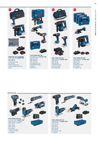 5-TLG. PROFI-SET 12V0%u2005615%u2005A00%u200517D / 983.00* CHF GSR 12V-15 FC + Zubeh%u00f6rGOP 12V-28 + Zubeh%u00f6rGST 12V-70GHO 12V-20 GWS 12V-76GAL%u200512V-402%u2009%u00d7%u2009GBA 12V 2.0Ah1%u2009%u00d7%u2009GBA 12V 3.0Ahin XL-BOXX5-TLG. PROFI-SET 12V0%u2005615%u2005A00%u200517C / 820.00* CHF GOP 12V-28GSR 12V-15GST 12V-70GSA 12V-14GKS 12V-26GAL%u200512V-203%u2009%u00d7%u2009GBA 12V 3.0Ahin XL-BOXX12V-Profi-SetsPROFI-SET 18V + ZUBEH%u00d6R0%u2005615%u2005V00%u200503D /574.00* CHF GSR 18V-45GBH 18V-222%u2009%u00d7%u2009GBA 18V 5.0AhGAL 18V-4045-tlg. Zubeh%u00f6r-Set3-tlg. SDS-plus-Bohrer-SetKarton3-TLG. PROFI-SET 18V0%u2005615%u2005990%u2005N2X /1%u2009216.00* CHFGSR 18V-110 CGWX 18V-10 PGBH 18V-26 FGAL 18V-160 CProCORE18V 4.0AhProCORE18V 8.0AhXL-BOXXL-BOXX 1363TLG. PROFI-SET 18V0%u2005615%u2005A50%u2005093 / 800.00* CHF GBH 18V-22GSR 18V-65GDX 18V-2853%u2009%u00d7%u2009GBA 18V 5,0AhGAL 12V/18V-80Werkzeugtasche3TLG. PROFI-SET 18V0%u2005615%u2005A50%u200509G / 727.00* CHF GSR 18V-65GBH 18V-22GWS 18V-82%u2009%u00d7%u2009GBA 18V 5,0AhGAL 18V-403%u2009%u00d7%u2009L-BOXX 136NEU! NEU! NEU!31Bosch PRO NEWS | 01.09. bis 31.12.2025