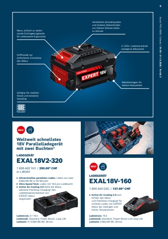 LADEGER%u00c4TEXAL18V2-320 LADEGER%u00c4TEXAL18V-160 1%u2005600%u2005A02%u2005YH1 / 295.00* CHF in L-BOXX1%u2005600%u2005A03%u2005D3C / 137.00* CHF %u25fe Active Air Cooling 2.0 zum K%u00fchlen des Akkus und FlexTemp Charging2 f%u00fcr sicheres Laden von EXPERT Akkus bei niedrigen und hohen TemperaturenLadestrom: 16%u2009A Lademodi: Standard, Power Boost und Long Life Ladezeit: EXBA18V-80: 39%u2009minLadestrom: 2%u2009%u00d7%u200916%u2009A Lademodi: Standard, Power Boost, Long Life Ladezeit: 2%u2009%u00d7%u2009EXBA18V-80: 39%u2009minNeue, einfach zu bedienende Entriegelungstaste f%u00fcr verbesserte ErgonomieGriffmulde zur einfacheren Entnahme des AkkusSoftgrip f%u00fcr stabilen Stand und besseres HandlingMetalleinlagen f%u00fcr h%u00f6here Robustheit5 LEDs: Ladestzustandsanzeige & AkkucheckVerst%u00e4rktes Kontaktsystem und dickere Zellverbinder, um h%u00f6here Str%u00f6me leiten zu k%u00f6nnenSOFT GRIP%u25fe Ultraschnelles paralleles Laden: Laden von zwei EXBA18V-80 in 39 Minuten%u25fe Ultra Speed Tech: Laden mit 16%u2009A pro Ladebucht%u25fe Active Air Cooling 3.0 k%u00fchlt die Akkus, w%u00e4hrend FlexTemp Charging2 den Ladetemperaturbereich von EXPERT Akkus vergr%u00f6ssertWeltweit schnellstes 18V Parallelladeger%u00e4t mit zwei Buchten4NEU!NEU!5Bosch PRO NEWS Schweiz | 01.09.%u2009%u2013%u200931.12.2025 | Tertial 3