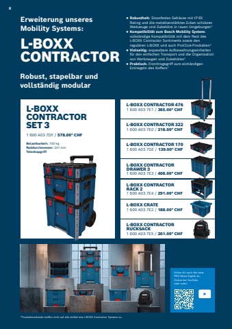 Schau dir auch die neue PRO News Digital an. Online bei YouTube oder unter: L-BOXX CONTRACTOR SET 31%u2005600%u2005A03%u20057DY / 578.00* CHF Belastbarkeit: 100%u2009%u2009kgRaddurchmesser: 241%u2009mmTeleskopgriffErweiterung unseres Mobility Systems:L-BOXX CONTRACTORRobust, stapelbar und vollst%u00e4ndig modularL-BOXX CONTRACTOR DRAWER 31%u2005600%u2005A03%u20057E3 / 408.00* CHF L-BOXX CONTRACTOR RACK 21%u2005600%u2005A03%u20057E4 / 291.00* CHF L-BOXX CRATE1%u2005600%u2005A03%u20057E2 / 188.00* CHF L-BOXX CONTRACTOR RUCKSACK1%u2005600%u2005A03%u20057E5 / 261.00* CHF 1%u2009Produktmerkmale treffen nicht auf alle Artikel des L-BOXX Contractor Systems zu.%u25fe Robustheit: Stossfestes Geh%u00e4use mit IP%u200665 Rating und die metallverst%u00e4rkten Ecken sch%u00fctzen Werkzeuge und Zubeh%u00f6re in rauen Umgebungen1%u25fe Kompatibilit%u00e4t zum Bosch Mobility System:vollst%u00e4ndige Kompatibilit%u00e4t mit dem Rest des L-BOXX Contractor Sortiments sowie den regul%u00e4ren L-BOXX und auch ProClick-Produkten1%u25fe Vielseitig: anpassbare Aufbewahrungseinheiten f%u00fcr den einfachen Transport und die Organisation von Werkzeugen und Zubeh%u00f6ren1%u25fe Praktisch: Fronttragegriff zum einh%u00e4ndigen Entriegeln des Koffers1L-BOXX CONTRACTOR 1701%u2005600%u2005A03%u20057DZ / 139.00* CHFL-BOXX CONTRACTOR 3221%u2005600%u2005A03%u20057E0 / 218.00* CHF L-BOXX CONTRACTOR 4761%u2005600%u2005A03%u20057E1 / 365.00* CHF 8
