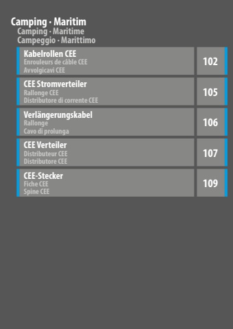 Camping %u00b7 MaritimeCamping %u00b7 MaritimCampeggio %u00b7 MarittimoKabelrollen CEEEnrouleurs de c%u00e2ble CEE Avvolgicavi CEE102CEE StromverteilerRallonge CEE Distributore di corrente CEE105Verl%u00e4ngerungskabelRallongeCavo di prolunga106CEE VerteilerDistributeur CEE Distributore CEE107CEE-SteckerFiche CEE Spine CEE109