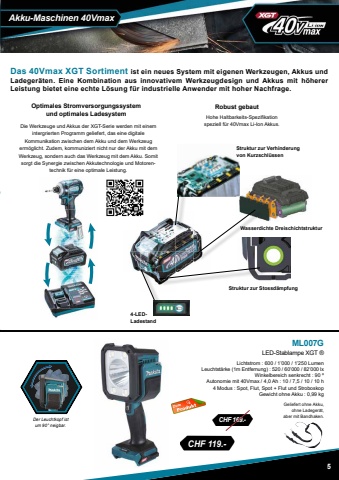 +CHF 119.-CHF 169.- Das 40Vmax XGT Sortiment ist ein neues System mit eigenen Werkzeugen, Akkus und Ladeger%u00e4ten. Eine Kombination aus innovativem Werkzeugdesign und Akkus mit h%u00f6herer Leistung bietet eine echte L%u00f6sung f%u00fcr industrielle Anwender mit hoher Nachfrage.Optimales Stromversorgungssystemund optimales LadesystemDie Werkzeuge und Akkus der XGT-Serie werden mit einem intergrierten Programm geliefert, das eine digitale Kommunikation zwischen dem Akku und dem Werkzeug erm%u00f6glicht. Zudem, kommuniziert nicht nur der Akku mit dem Werkzeug, sondern auch das Werkzeug mit dem Akku. Somit sorgt die Synergie zwischen Akkutechnologie und Motorentechnik f%u00fcr eine optimale Leistung.Robust gebautHohe Haltbarkeits-Spezifikation speziell f%u00fcr 40Vmax Li-Ion Akkus.4-LEDLadestandStruktur zur Stossd%u00e4mpfungWasserdichte DreischichtstrukturStruktur zur Verhinderung von Kurzschl%u00fcssenAkku-Maschinen 40VmaxDer Leuchtkopf ist um 90%u00b0 neigbar.ML007GLED-Stablampe XGT %u00aeLichtstrom : 600 / 1%u2019000 / 1%u2019250 LumenLeuchtst%u00e4rke (1m Entfernung) : 520 / 60%u2019000 / 82%u2019000 lxWinkelbereich senkrecht : 90 %u00baAutonomie mit 40Vmax / 4,0 Ah : 10 / 7,5 / 10 / 10 h4 Modus : Spot, Flut, Spot + Flut und StroboskopGewicht ohne Akku : 0,99 kgGeliefert ohne Akku, ohne Ladeger%u00e4t, aber mit Bandhaken.6 5