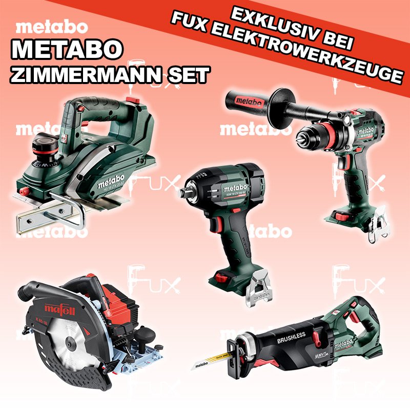 Heute auf dieses Produkt 21% Rabatt! Zu "Zimmermann Set" von Metabo FULL Service: 36 Monate zum Nulltarif für Sie! Weitere Infos zum FULL Service Dieses Produkt ist CAS kompatibel! Weitere Infos zu CAS Black Fuxday Aktionen FUX SPECIAL EXKLUSIV BEI FUX Metabo Zimmermann SET 7 SOLO Bestell- und Artikelnummer: Zimmermann SET 7 SOLO BS 18 LTX BL Q I Akku-BohrschrauberAkkuspannung 18 V Drehzahl 0-550 / 0-2000 U/min Drehmoment hart / weich 130 / 65 Nm Gewicht (mit Akkupack) 2.3 kgInfos SSW 18 LTX 550 BL Akku-SchlagschrauberAkkuspannung 18 V Anziehdrehmoment 550 Nm Werkzeugaufnahme 1/2" Gewicht ohne Akkupack 1,4 kgInfos SSEP 18 LTX BL MVT Akku-SäbelsägeAkkuspannung 18 V Hubzahl bei Leerlauf 0 - 3.000 /min Gewicht (mit Akkupack) 4.6 kgInfos HO 18 LTX 20-82 Akku-Einhand-HobelAkkuspannung 18 V Hobelbreite 82 mm Spanabnahme einstellbar 0-2 mm Gewicht 3.5 KgInfos K 85 - 18 PURE Akku-Handkreissägen im L-MAXSchnitttiefe 0 – 88 mm Schnitttiefe bei 45° 0 – 61.5 mm Gewicht (mit Akku) 8.1 kgInfos Registriere die in diesem Set vorhandenen Metabo Maschinen auf metabo.ch, und ergattere dir bis zu 5 Gratis Akkus!Zusätzlich offerieren wir zu diesem Set einen Gratis Akku!OHNE AKKUS UND LADEGERÄT Standard-Ausrüstung In diesem Set enthalten: BS 18 LTX BL Q I Akku-Bohrschrauber SSW 18 LTX 550 BL Akku-Schlagschrauber SSEP 18 LTX BL MVT Akku-Säbelsäge HO 18 LTX 20-82 Akku-Einhand-Hobel K 85 - 18 PURE Akku-Handkreissägen im L-MAX Listenpreis CHF 2'582.20 Fuxpreis CHF 2'040.00 inkl. 8.1% MwSt, inkl vRG Versand CHF 25.00 Kein Grauimport! Produkt bestellen 1 Stück 2 Stück 3 Stück 4 Stück 5 Stück 6 Stück 7 Stück 8 Stück 9 Stück 10 Stück Alle Angaben ohne Gewähr und solange Vorrat reicht!Wiederverkäufer werden? Produkt als PDF NEUHEITAKTION 21%