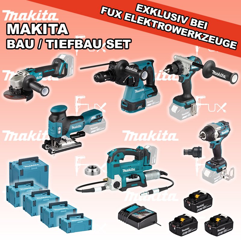 Makita Bau / Tiefbau Set 4 DDF492Z Akku-Bohrschrauber DJV18ZJ Akku-Stichsäge DHR243ZJ Akku-Bohrhammer DGA506ZJ Akku-Winkelschleifer DTW700Z Akku-Schlagschrauber DGP180Z Akku-Fettpresse BL 1860 B ( Li-Ion Akku ) DC 18 RC Schnell-Ladegerät Reduktions Adapter Adapter für Lube-Shuttle® 400G MAKPAC Gr. 2 MAKPAC Gr. 3 Einsatz für diverse Akkuschrauber Einsatz für DTW1001 / DTW1002 / DTW450