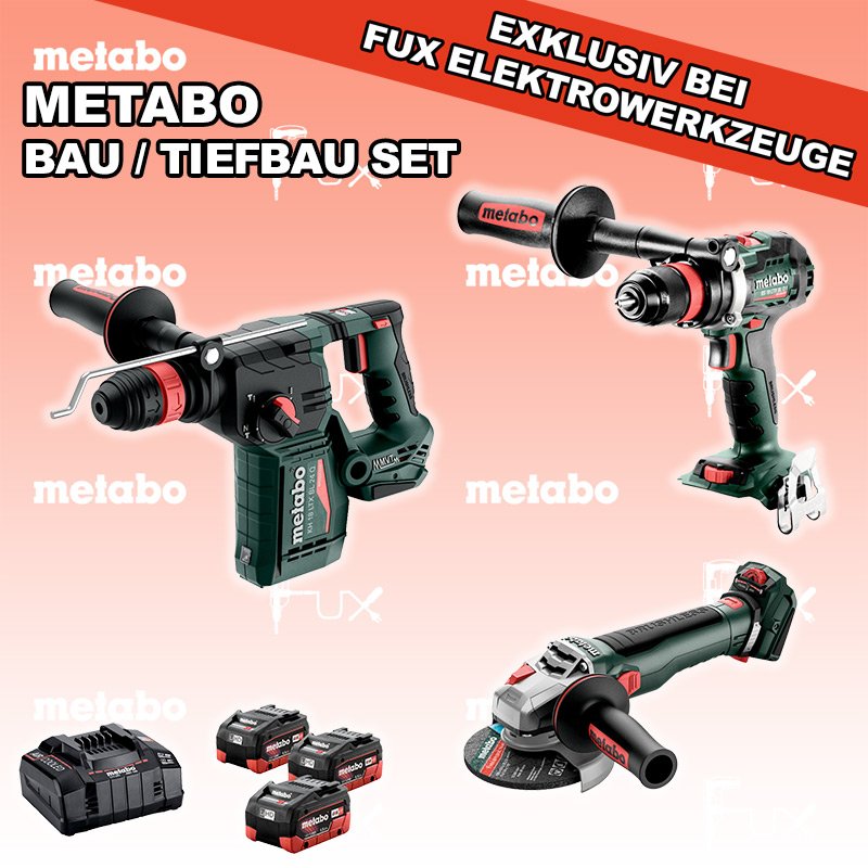 Zu "Bau / Tiefbau Set" von Metabo FULL Service: 36 Monate zum Nulltarif für Sie! Weitere Infos zum FULL Service FUX SPECIAL EXKLUSIV BEI FUX Metabo Bau / Tiefbau Set 5 Bestell- und Artikelnummer: Bau / Tiefbau Set 5 BS 18 LTX BL Q I Akku-BohrschrauberAkkuspannung 18 V Drehzahl 0-550 / 0-2000 U/min Drehmoment hart / weich 130 / 65 Nm Gewicht (mit Akkupack) 2.3 kgInfos KH 18 LTX BL 24 Q Akku-KombihammerAkkuspannung 18 V Einzelschlagstärke 2.2 J Bohrleistung in Beton 24 mm Gewicht ohne Akkupack 3 kgInfos WVB 18 LT BL 11-125 Quick Akku-WinkelschleiferAkkuspannung 18 V Drehzahl 2.800 - 10.000 / min Ø 125 mm Scheiben Gewicht (mit Akkupack) 2.5 kgInfos 3 x 18 V, 5.5 Ah, LiHD Akkupack18 V 5.5 Ah ( LiHD Akkus ) Infos ASC 145, 12 - 36 V "Air Cooled" LadegerätZum Aufladen aller Li-Power Schiebesitz-Akkupacks (12 V - 36 V). Ladestrom 8.0 AInfos Registriere die in diesem Set vorhandenen Metabo Maschinen auf metabo.ch, und ergattere dir bis zu 5 Gratis Akkus!Zusätzlich offerieren wir zu diesem Set einen Gratis Akku! Standard-Ausrüstung In diesem Set enthalten: BS 18 LTX BL Q I Akku-Bohrschrauber KH 18 LTX BL 24 Q Akku-Kombihammer WVB 18 LT BL 11-125 Quick Akku-Winkelschleifer 3 x 18 V, 5.5 Ah, LiHD Akkupack ASC 145, 12 - 36 V "Air Cooled" Ladegerät Listenpreis CHF 1'509.00 Fuxpreis CHF 1'031.00 inklusive 8.1% MwSt Frankolieferung Kein Grauimport! Produkt bestellen 1 Stück 2 Stück 3 Stück 4 Stück 5 Stück 6 Stück 7 Stück 8 Stück 9 Stück 10 Stück Alle Angaben ohne Gewähr und solange Vorrat reicht!Wiederverkäufer werden? Produkt als PDF NEUHEITAKTION 31%
