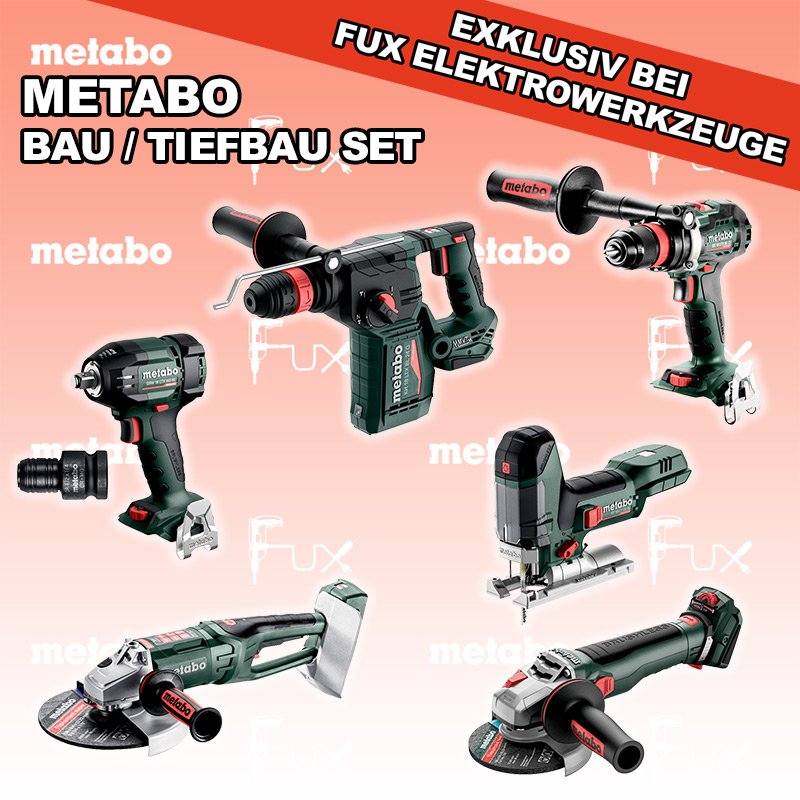 Das Ladenlokal bleibt vom 23. Februar 2026 bis am 28. Februar 2026 geschlossen. Bestellungen und Lieferungen von Neugeräten werden trotz Ferienabwesenheit in gewohnter Fux-Manier entgegengenommen und ausgeliefert. Zu "Bau / Tiefbau Set" von Metabo FUX SPECIAL EXKLUSIV BEI FUX Metabo Bau / Tiefbau Set 10 SOLO Bestell- und Artikelnummer: Bau / Tiefbau Set 10 SOLO FULL Service: 36 Monate zum Nulltarif für Sie! Weitere Infos zum FULL Service BS 18 LTX BL Q I Akku-BohrschrauberAkkuspannung 18 V Drehzahl 0-550 / 0-2000 U/min Drehmoment hart / weich 130 / 65 Nm Gewicht (mit Akkupack) 2.3 kgInfos ST 18 LT 130 BL Akku-StichsägeAkkuspannung 18 V Hubzahl 1000-3.500 /min Gewicht ohne Akkupack 1.5 kgInfos KH 18 LTX BL 24 Q Akku-KombihammerAkkuspannung 18 V Einzelschlagstärke 2.2 J Bohrleistung in Beton 24 mm Gewicht ohne Akkupack 3 kgInfos WVB 18 LT BL 11-125 Quick Akku-WinkelschleiferAkkuspannung 18 V Drehzahl 2.800 - 10.000 / min Ø 125 mm Scheiben Gewicht (mit Akkupack) 2.5 kgInfos WPB 36-18 LTX BL 24-230 Akku-WinkelschleiferAkkuspannung 2 x 18 V Drehzahl 6600 U / min Ø 230 mm Scheiben Gewicht (mit Akkupack) 6.5 kgInfos SSW 18 LTX 550 BL Akku-SchlagschrauberAkkuspannung 18 V Anziehdrehmoment 550 Nm Werkzeugaufnahme 1/2" Gewicht ohne Akkupack 1,4 kgInfos Adapter für Lube-Shuttle® 400GAdapter zum Umrüsten von Fettbehälter auf Lube-Shuttle®* Kartusche 400g geeignet für FP 18 LTXInfos Registriere die in diesem Set vorhandenen Metabo Maschinen auf metabo.ch, und ergattere dir bis zu 5 Gratis Akkus!Zusätzlich offerieren wir zu diesem Set einen Gratis Akku!OHNE AKKUS UND LADEGERÄT Standard-Ausrüstung In diesem Set enthalten: BS 18 LTX BL Q I Akku-Bohrschrauber ST 18 LT 130 BL Akku-Stichsäge KH 18 LTX BL 24 Q Akku-Kombihammer WVB 18 LT BL 11-125 Quick Akku-Winkelschleifer WPB 36-18 LTX BL 24-230 Akku-Winkelschleifer SSW 18 LTX 550 BL Akku-Schlagschrauber Adapter für Lube-Shuttle® 400G Listenpreis CHF 2'163.00 Fuxpreis CHF 1'478.00 inklusive 8.1% MwSt Frankolieferung Kein Grauimport! Produkt bestellen 1 Stück 2 Stück 3 Stück 4 Stück 5 Stück 6 Stück 7 Stück 8 Stück 9 Stück 10 Stück Alle Angaben ohne Gewähr und solange Vorrat reicht!Wiederverkäufer werden? Produkt als PDF NEUHEIT 31%