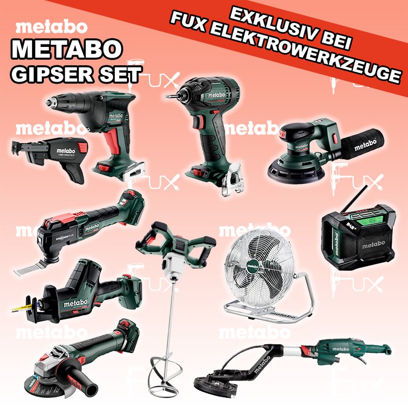 Das Ladenlokal bleibt vom 23. Februar 2026 bis am 28. Februar 2026 geschlossen. Bestellungen und Lieferungen von Neugeräten werden trotz Ferienabwesenheit in gewohnter Fux-Manier entgegengenommen und ausgeliefert. Zu "Gipser Set" von Metabo FUX SPECIAL EXKLUSIV BEI FUX Metabo Gipser Set 8 SOLO Bestell- und Artikelnummer: Gipser Set 8 SOLO FULL Service: 36 Monate zum Nulltarif für Sie! Weitere Infos zum FULL Service BS 18 L BL Q Akku-BohrschrauberAkkuspannung 18 V Drehzahl 0 - 500 / 0 - 1700 /min Drehmoment hart / weich 60 / 28 Nm Gewicht (mit Akkupack) 1.3 kgInfos TBS 18 LTX BL 5000 Akku-TrockenbauschrauberAkkuspannung 18 V Leerlaufdrehzahl 0 - 5.000 /min Max. Drehmoment weich 6 Nm Gewicht mit Akkupack 1,3 kgInfos RW 18 LTX BL 140-2 Akku-RührwerkAkkuspannung 18 V Max. Rührkorb-Durchmesser 140 mm Max. empfohlene Mischmenge 50 l Werkzeugaufnahme Innengewinde M 14 Infos SSD 18 LTX 200 BL Akku-Schlagschrauber Akkuspannung 18 V Anziehdrehmoment 200 Nm Werkzeugaufnahme 1/4" Gewicht 1.3 kgInfos WVB 18 LT BL 11-125 Quick Akku-WinkelschleiferAkkuspannung 18 V Drehzahl 2.800 - 10.000 / min Ø 125 mm Scheiben Gewicht (mit Akkupack) 2.5 kgInfos R 12-18 DAB+ BT Akku-BaustellenradioDAB+ Akkuspannung 12 V / 18 V Extreme Akkupacks mit 14,4 und 18 Volt Gewicht 1.85 kgInfos SSE 18 LTX BL Compact Akku-SäbelsägeAkkuspannung 18 V Hubzahl 0-3000 min-1 Hublängen 16 mm Gewicht (mit Akkupack) 1.8 kgInfos MT 18 LTX BL QSL Akku-Multitool Akkuspannung 18 V Schwingzahl bei Leerlauf 8.000 - 20.000 /min Schleifplatte, Maß Eck zu Eck 93 mm Gewicht 1.7 kgInfos AV 18 Akku-VentilatorAkkuspannung 18 V Max. Luftgeschwindigkeit 3,8 m/s Flügeldurchmesser 355 mm Gewicht (mit Akkupack) 1,2 kgInfos LSV 5-225 Comfort LanghalsschleiferLeistungsaufnahme 500 Watt Durchmesser Schleifteller 225 mm Leerlaufdrehzahl 1000 - 1650 min-1 Gewicht 4.5 kgInfos Schrauber-Magazin Speed Fix 57Robustes Schrauber-Magazin geeignet für TBS 18 LTX 5000 und HBS 18 LTX 3000Infos Ergattere dir einen Akku bei der Registration auf metabo.ch Alle Produkte dieser Aktion anzeigen OHNE AKKUS UND LADEGERÄT Standard-Ausrüstung In diesem Set enthalten: BS 18 L BL Q Akku-Bohrschrauber TBS 18 LTX BL 5000 Akku-Trockenbauschrauber RW 18 LTX BL 140-2 Akku-Rührwerk SSD 18 LTX 200 BL Akku-Schlagschrauber WVB 18 LT BL 11-125 Quick Akku-Winkelschleifer R 12-18 DAB+ BT Akku-Baustellenradio SSE 18 LTX BL Compact Akku-Säbelsäge MT 18 LTX BL QSL Akku-Multitool AV 18 Akku-Ventilator LSV 5-225 Comfort Langhalsschleifer Schrauber-Magazin Speed Fix 57 Listenpreis CHF 3'401.50 Fuxpreis CHF 2'316.00 inklusive 8.1% MwSt Frankolieferung Kein Grauimport! Produkt bestellen 1 Stück 2 Stück 3 Stück 4 Stück 5 Stück 6 Stück 7 Stück 8 Stück 9 Stück 10 Stück Alle Angaben ohne Gewähr und solange Vorrat reicht!Wiederverkäufer werden? Produkt als PDF NEUHEITAKTION 31%