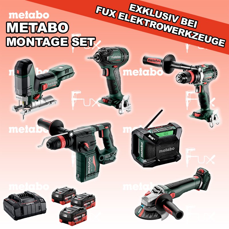 Zu "Montage Set" von Metabo FULL Service: 36 Monate zum Nulltarif für Sie! Weitere Infos zum FULL Service Dieses Produkt ist CAS kompatibel! Weitere Infos zu CAS FUX SPECIAL EXKLUSIV BEI FUX Metabo Montage Set 7 Bestell- und Artikelnummer: meMontage Set 7 ST 18 LT 130 BL Akku-StichsägeAkkuspannung 18 V Hubzahl 1000-3.500 /min Gewicht ohne Akkupack 1.5 kgInfos KH 18 LTX BL 24 Q Akku-KombihammerAkkuspannung 18 V Einzelschlagstärke 2.2 J Bohrleistung in Beton 24 mm Gewicht ohne Akkupack 3 kgInfos WB 18 LTX BL 15-125 Quick Akku-Winkelschleifer Akkuspannung 18 V so stark wie ein 1500 Watt Netzgerät Drehzahl 10000 U / min Ø 125 mm Scheiben Gewicht mit Akkupack 2,7 kgInfos SSD 18 LTX 200 BL Akku-Schlagschrauber Akkuspannung 18 V Anziehdrehmoment 200 Nm Werkzeugaufnahme 1/4" Gewicht 1.3 kgInfos R 12-18 DAB+ BT Akku-BaustellenradioDAB+ Akkuspannung 12 V / 18 V Extreme Akkupacks mit 14,4 und 18 Volt Gewicht 1.85 kgInfos BS 18 LTX BL Q I Akku-BohrschrauberAkkuspannung 18 V Drehzahl 0-550 / 0-2000 U/min Drehmoment hart / weich 130 / 65 Nm Gewicht (mit Akkupack) 2.3 kgInfos 3 x 18 V, 5.5 Ah, LiHD Akkupack18 V 5.5 Ah ( LiHD Akkus ) Infos ASC 145, 12 - 36 V "Air Cooled" LadegerätZum Aufladen aller Li-Power Schiebesitz-Akkupacks (12 V - 36 V). Ladestrom 8.0 AInfos Registriere die in diesem Set vorhandenen Metabo Maschinen auf metabo.ch, und ergattere dir bis zu 5 Gratis Akkus!Zusätzlich offerieren wir zu diesem Set einen Gratis Akku! Standard-Ausrüstung In diesem Set enthalten: ST 18 LT 130 BL Akku-Stichsäge KH 18 LTX BL 24 Q Akku-Kombihammer WB 18 LTX BL 15-125 Quick Akku-Winkelschleifer SSD 18 LTX 200 BL Akku-Schlagschrauber R 12-18 DAB+ BT Akku-Baustellenradio BS 18 LTX BL Q I Akku-Bohrschrauber 3 x 18 V, 5.5 Ah, LiHD Akkupack ASC 145, 12 - 36 V "Air Cooled" Ladegerät Zubehör Verbrauchsmaterial Listenpreis CHF 2'286.00 Fuxpreis CHF 1'372.00 inkl. 8.1% MwSt, inkl vRB Versand CHF 40.00 Kein Grauimport! Produkt bestellen 1 Stück 2 Stück 3 Stück 4 Stück 5 Stück 6 Stück 7 Stück 8 Stück 9 Stück 10 Stück Alle Angaben ohne Gewähr und solange Vorrat reicht!Wiederverkäufer werden? Produkt als PDFVideo LiHD 1Video LiHD 2 NEUHEITAKTION 40%